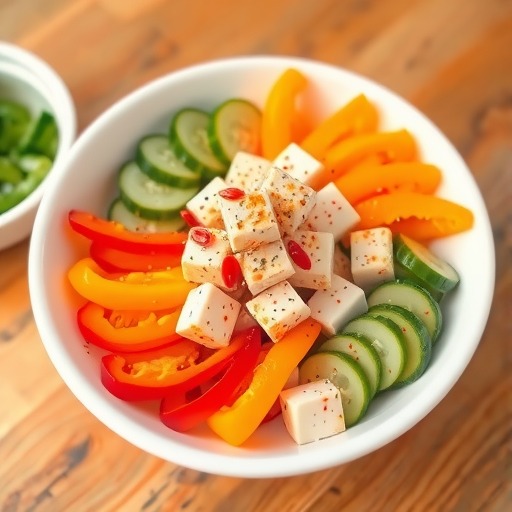 ⒋南豆腐切成块;小葱切成段,将豆腐丁和小葱段放在碗内,淋入盐水(将盐放入少许凉开水中化开调匀,加香油拌匀即可,爱吃辣的可以滴点辣椒油进去)。